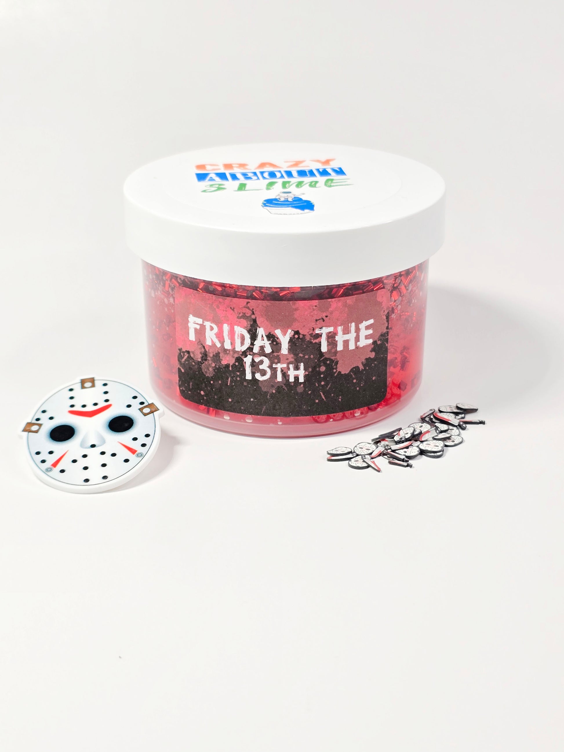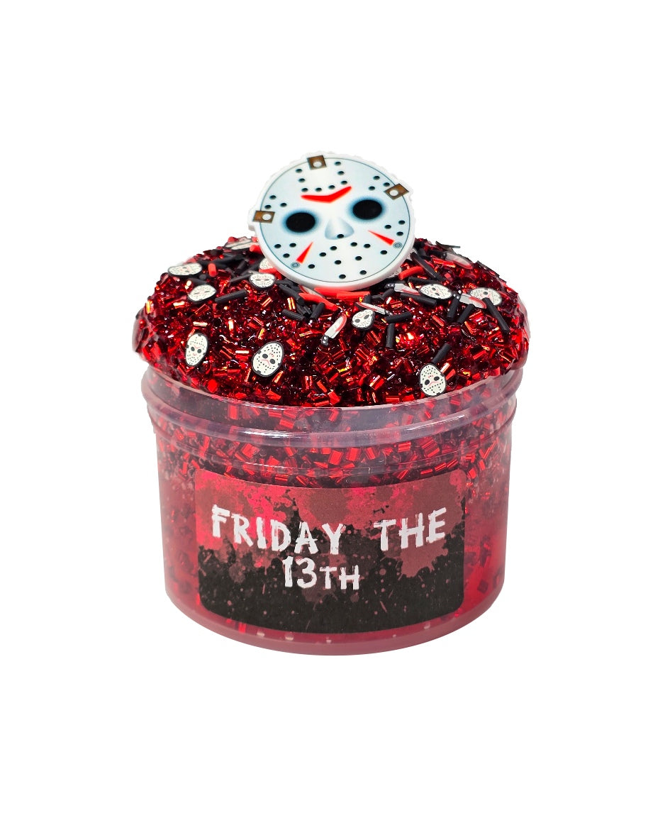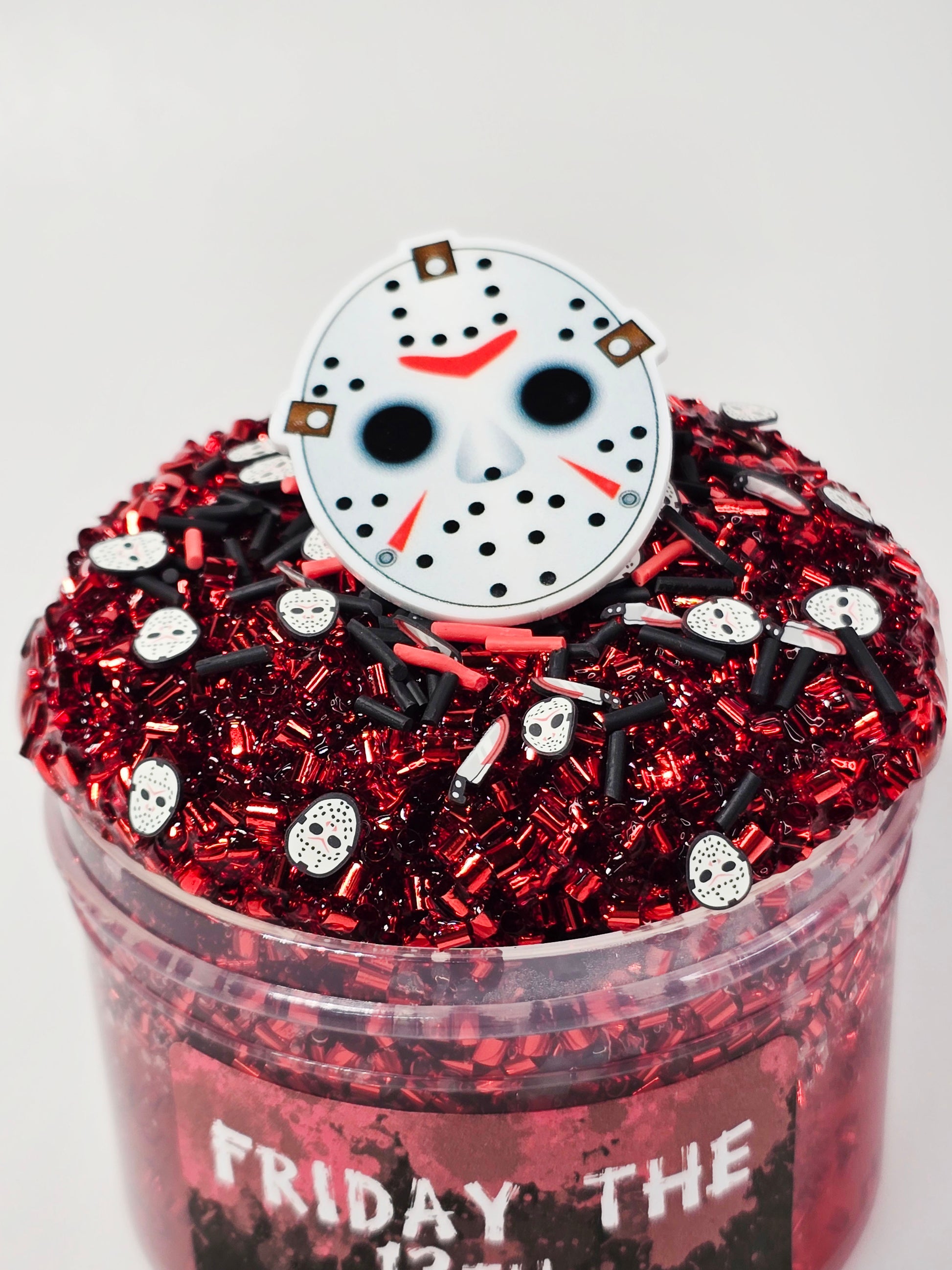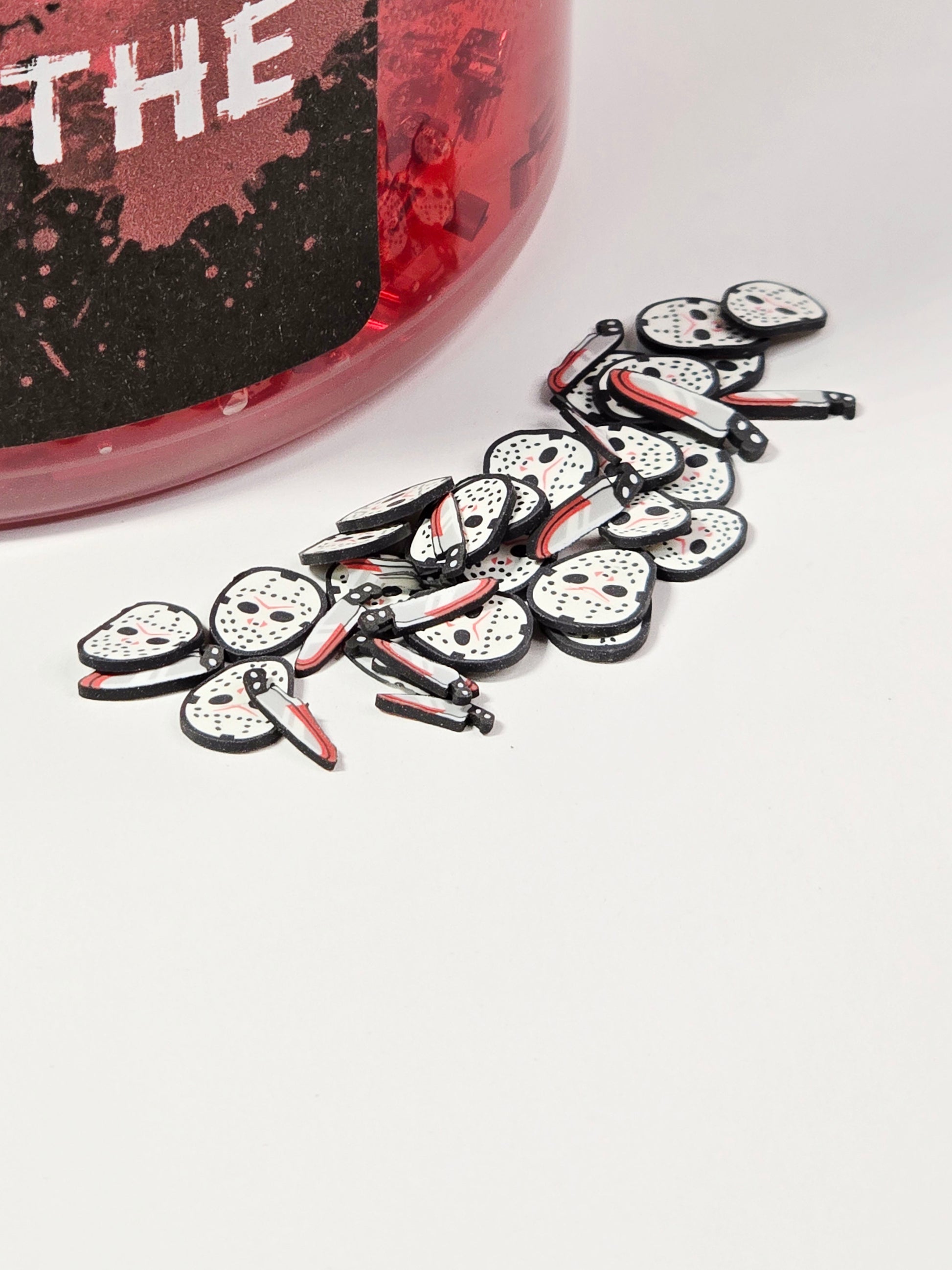 ADDONS - topped with Friday the 13th sprinkles, black and red sprinkles, and a Jason mask charm.