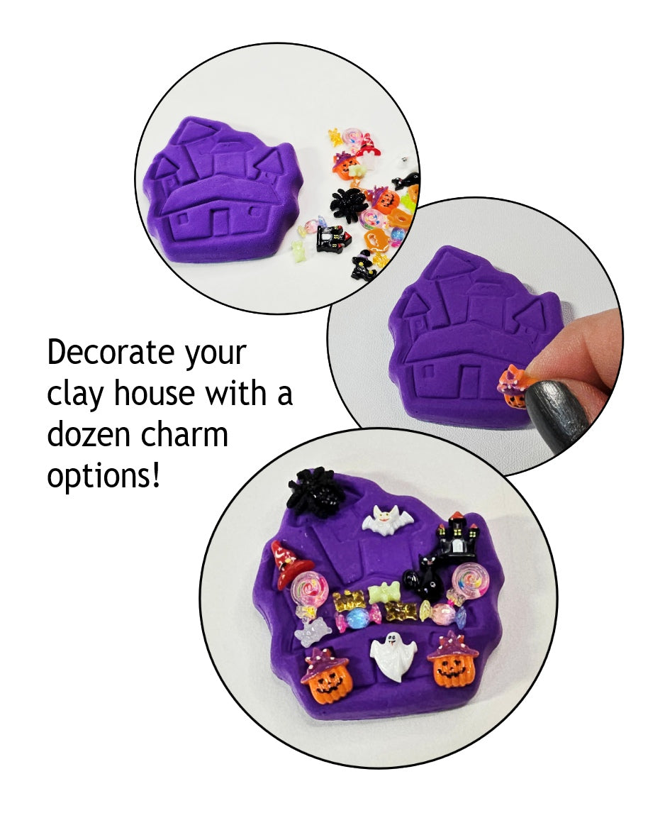 ADDONS - topped with a clay Halloween house addon and fun charms to decorate it with.