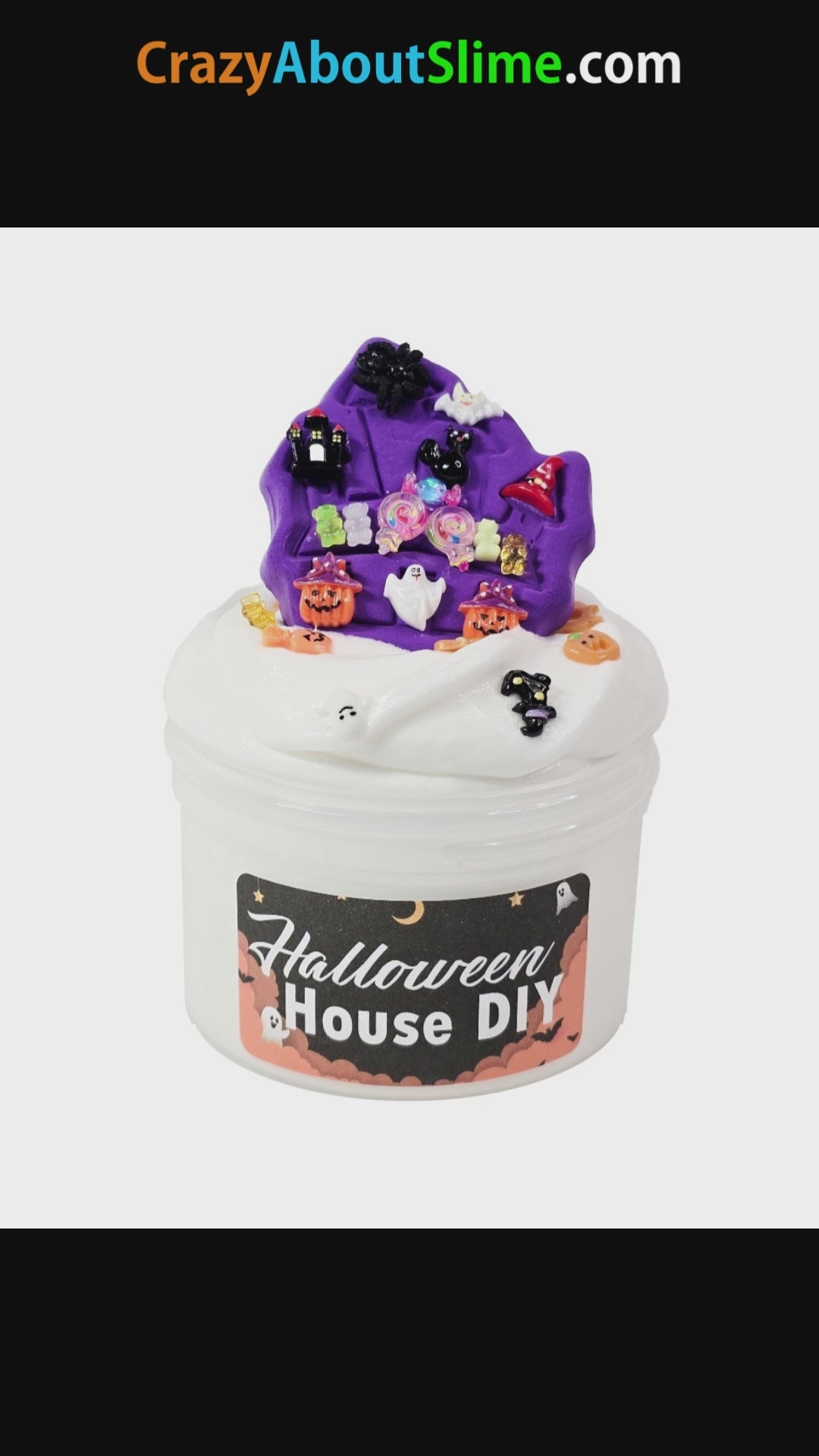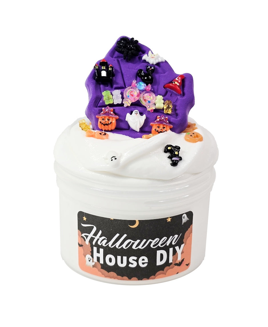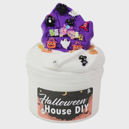 Introducing the "Halloween House DIY" slime – a delightful and interactive experience that combines the joy of slime with the festive spirit of creating your very own Halloween house masterpiece. The kit comes with a purple clay house addon, and tons of fun Halloween themed charms to decorate it with.