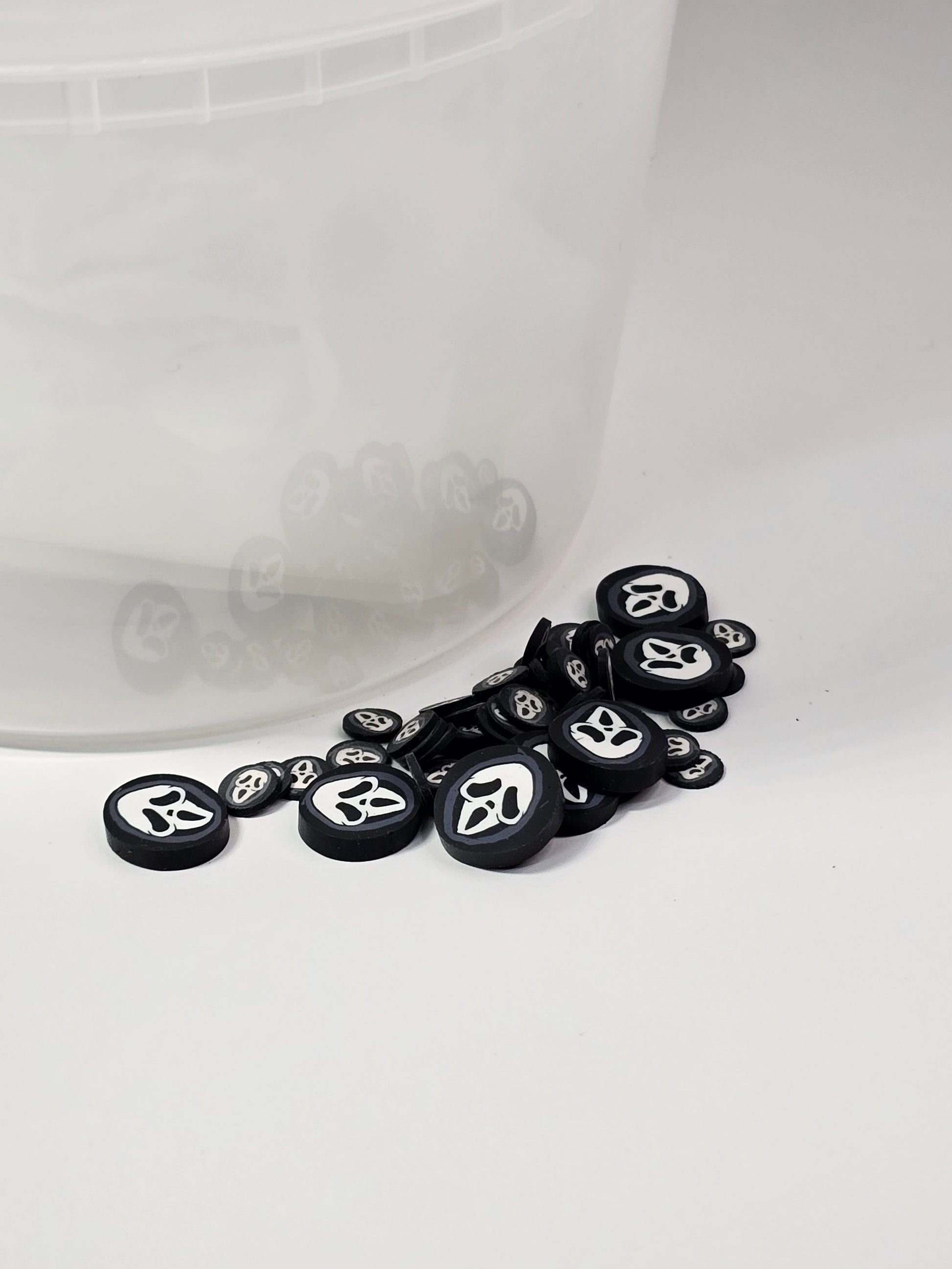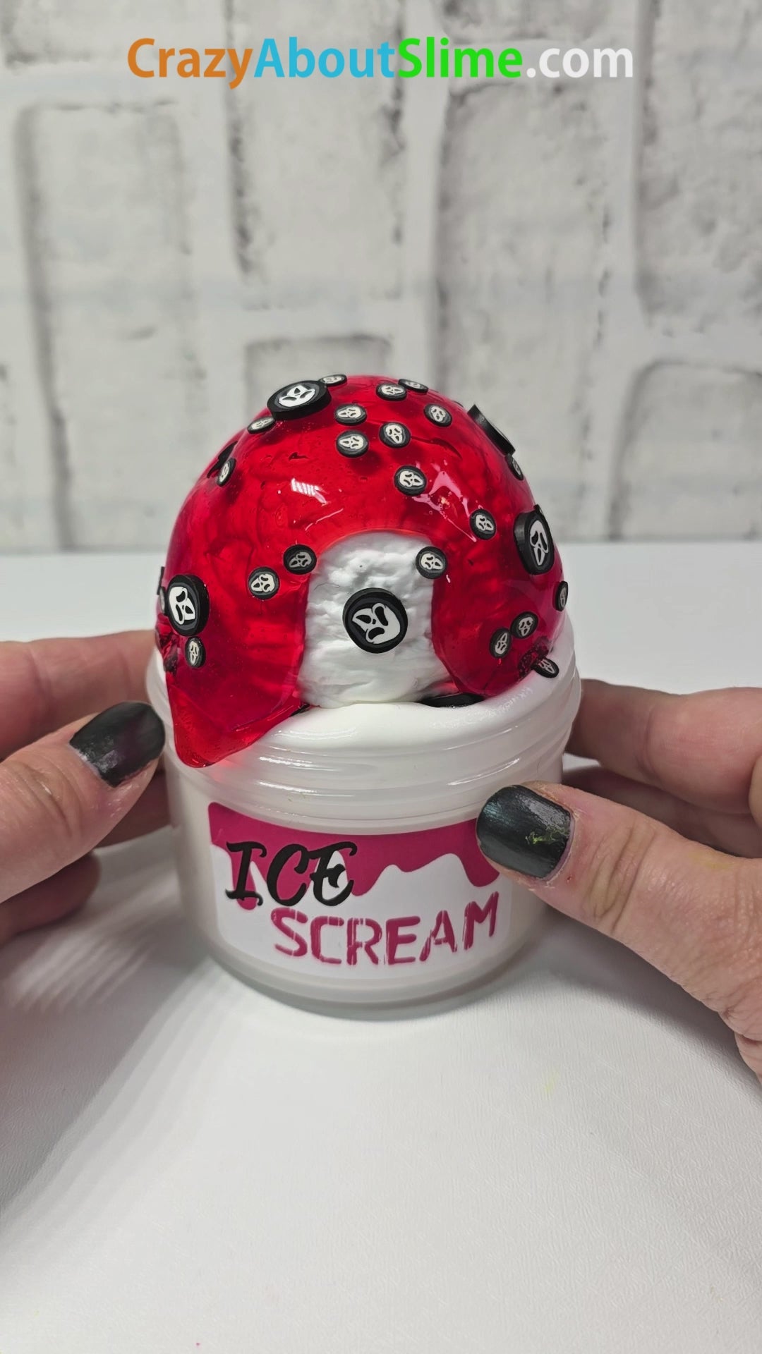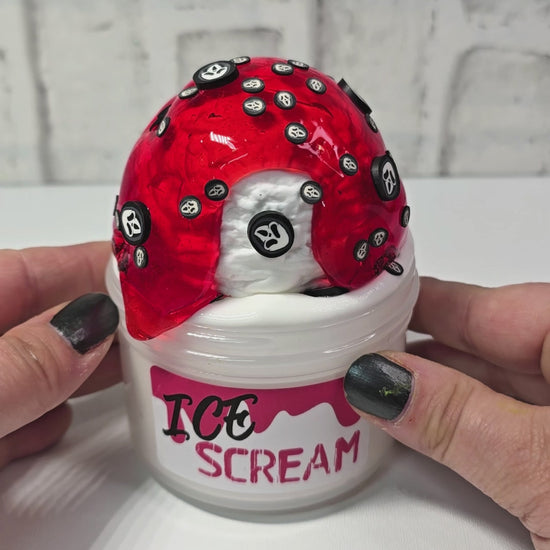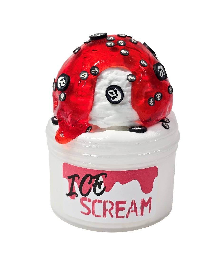 ADDONS - topped with red clear slime, clay ice cream topper, and Scream sprinkles.