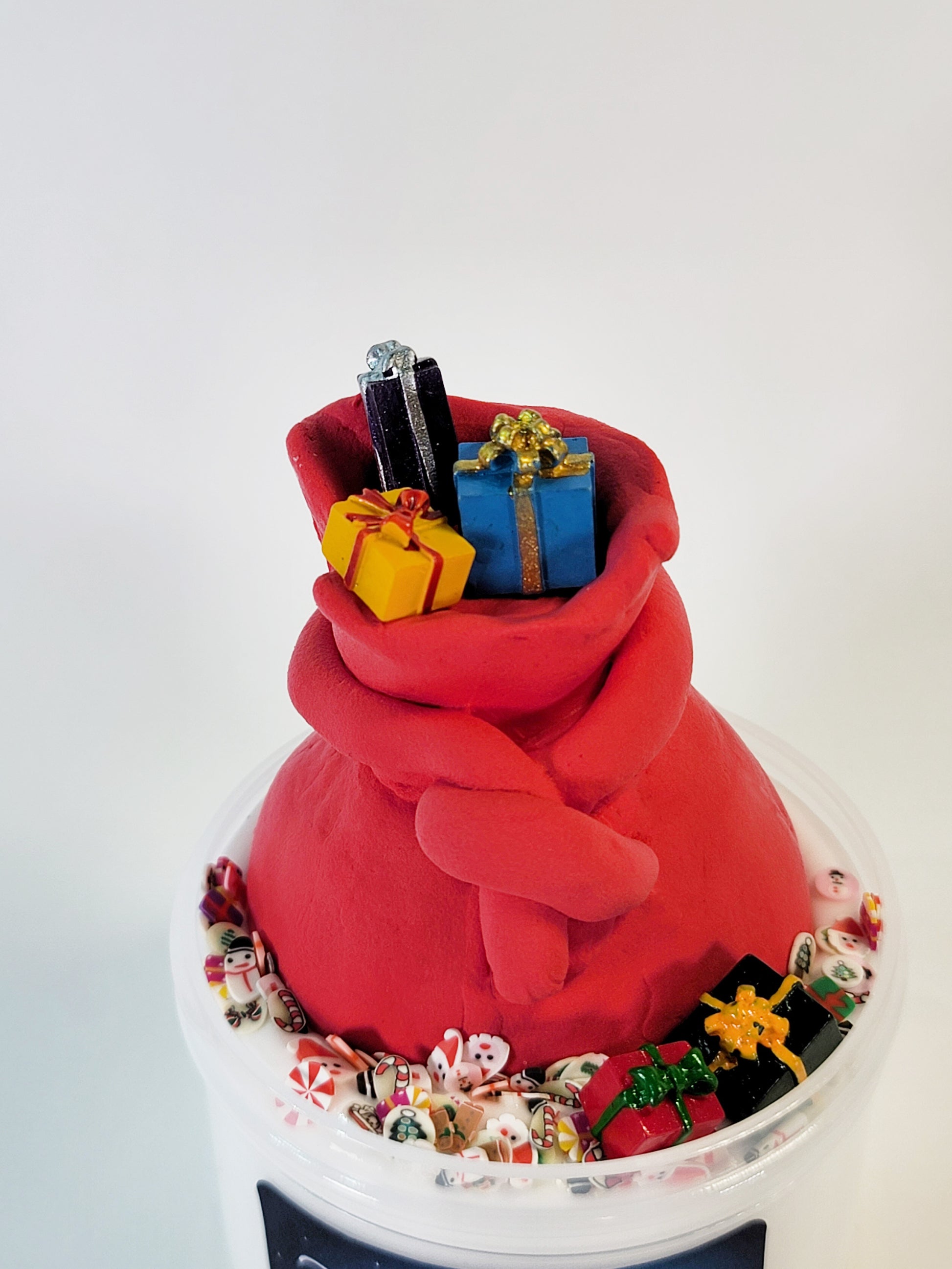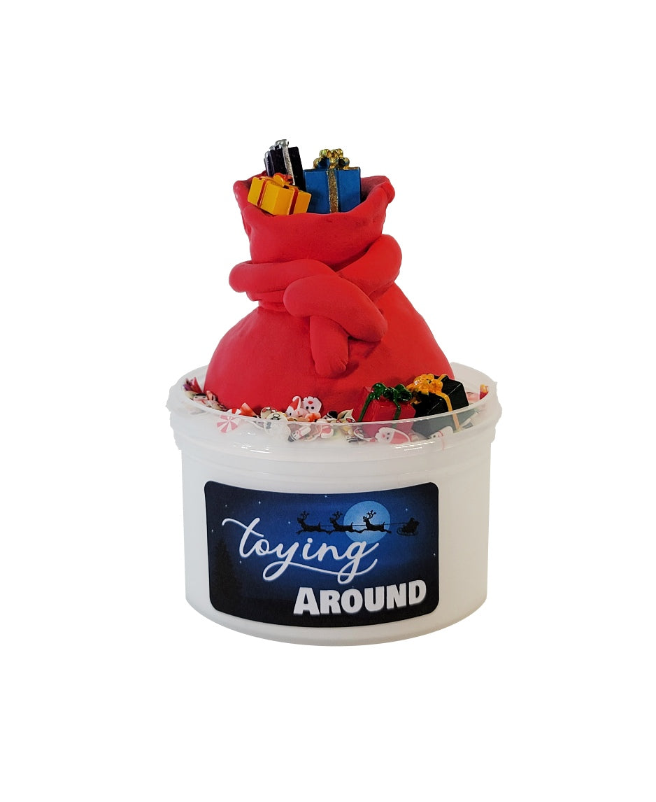 Toying Around slime, where whimsy meets sweetness – a confectionery masterpiece that captures the spirit of the holiday season. This enchanting creation is a soft golden hue, topped with a fun clay Santa sack full of you guessed it... presents!